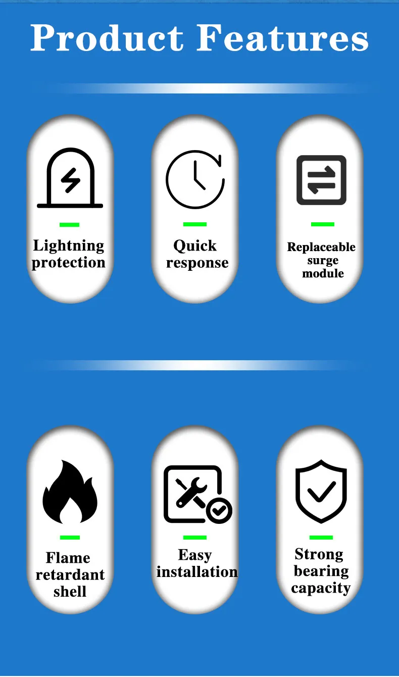 हमारे सर्ज लाइटनिंग अरेस्टर बिजली के उपकरणों में बिजली के उपकरणों में इलेक्ट्रॉनिक उपकरणों की रक्षा कर सकते हैं, जो बिजली के हमलों, ग्रिड में उतार -चढ़ाव या इलेक्ट्रोस्टैटिक डिस्चार्ज के कारण होने वाले वोल्टेज प्रभावों से हैं। इस प्रकार की सुरक्षा इनवर्टर और निगरानी उपकरण जैसे प्रमुख घटकों के सुरक्षित संचालन के लिए बहुत सहायक है।